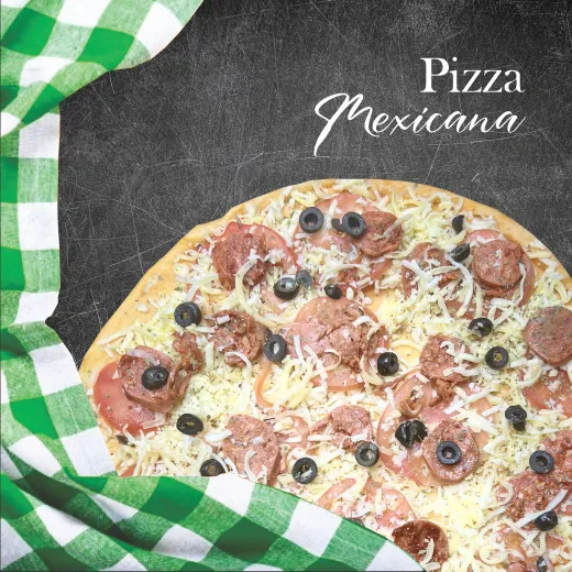 Salsa de tomate, mozzarella, tomate, longaniza picante, aceitunas, orégano