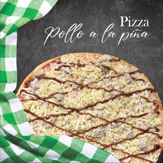Salsa de tomate, mozzarella, queso roquefort, pollo, piña, salsa barbacoa y albahaca seca